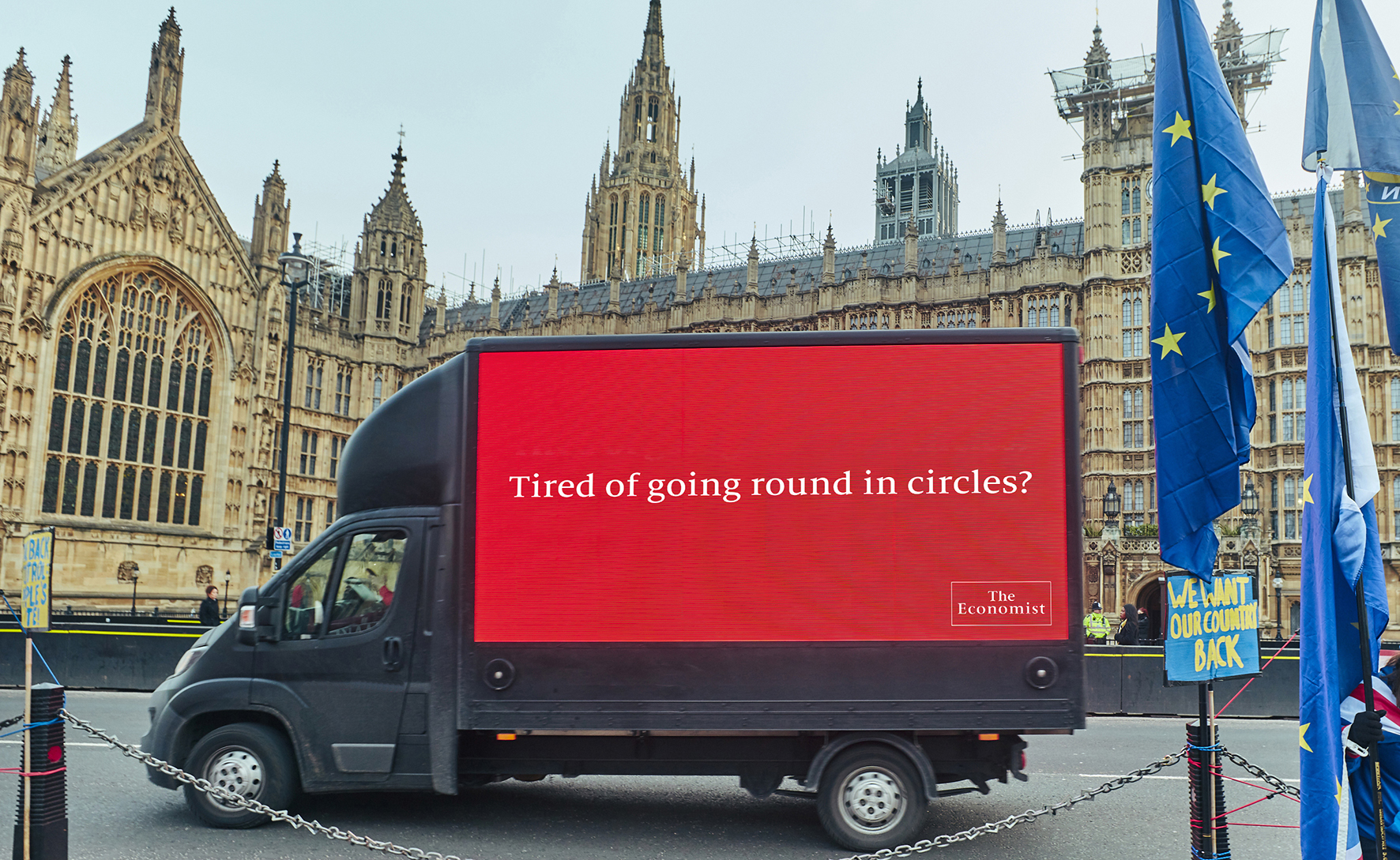 To highlight the circular nature of the Brexit talks we drove a very special Economist poster round and round (and round!) Parliament Square.